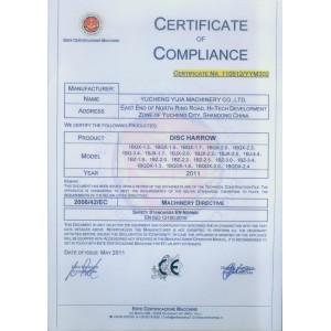 processing equipments of producing 10000 sets tractor plough, harrow, and a complete set of production line of punching, heat treatment, and painting for disc to reach yearly 1 million pcs of (plough) harrow discs. Our products could match with domestic tractor(CHINA YT, FOTON, SHANTUO, WEITUO, TIANTUO, SHANGTUO, YANTUO, CHANGTUO, QINGTUO, etc.), in addition, they also applies to foreign brand such as JOHN DEERE, NEW HOLLLAND, VALMET; our products have passed the evaluation of National products quality supervision and inspection office and technical advice station of agricultural machinery, passed the inspection of The State Administration for Entry-Exit Inspection and Quarantine, are all conformity with export commodity inspection requirements. Our products also passed CE and ISO9001 certification, have exported EU, North America high grade markets with large quantities. Our average annual export self-supporting amount has been reached TEN millions dollars, and our products have been exported to sixty three countries and regions.