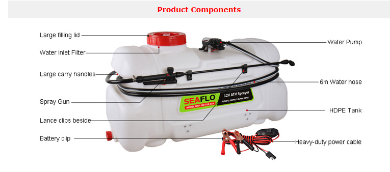 | Product Name | SEAFLO ATV Boom Spot Sprayer 12V 100L Capacity 3.1LPM Pump 80PSI | |