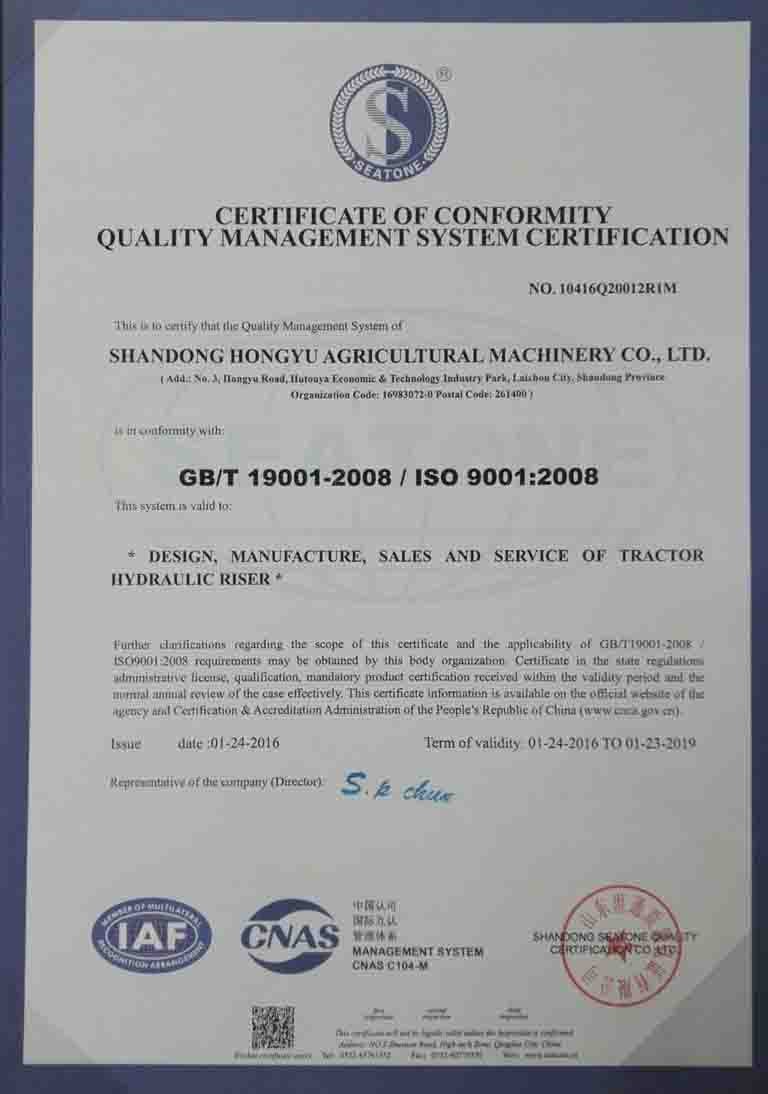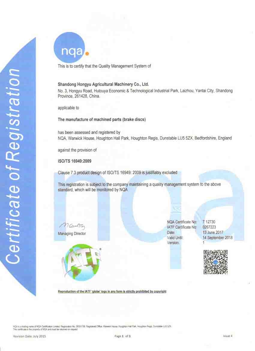 At present the Hongyu has won ISO9001, ISO / TS16949 quality management system certification, IOS14001 environmental management system certification, OHSAS18001 occupational health and safety management system certification, with four major serials, more than 500 varieties; 25 intellectual property rights, including 3 invention patents, 19 utility model patents, 3 appearance patents; 5 domestic industry technical standards are drafted by Hongyu, and implemented by the National Development and Reform Commission;