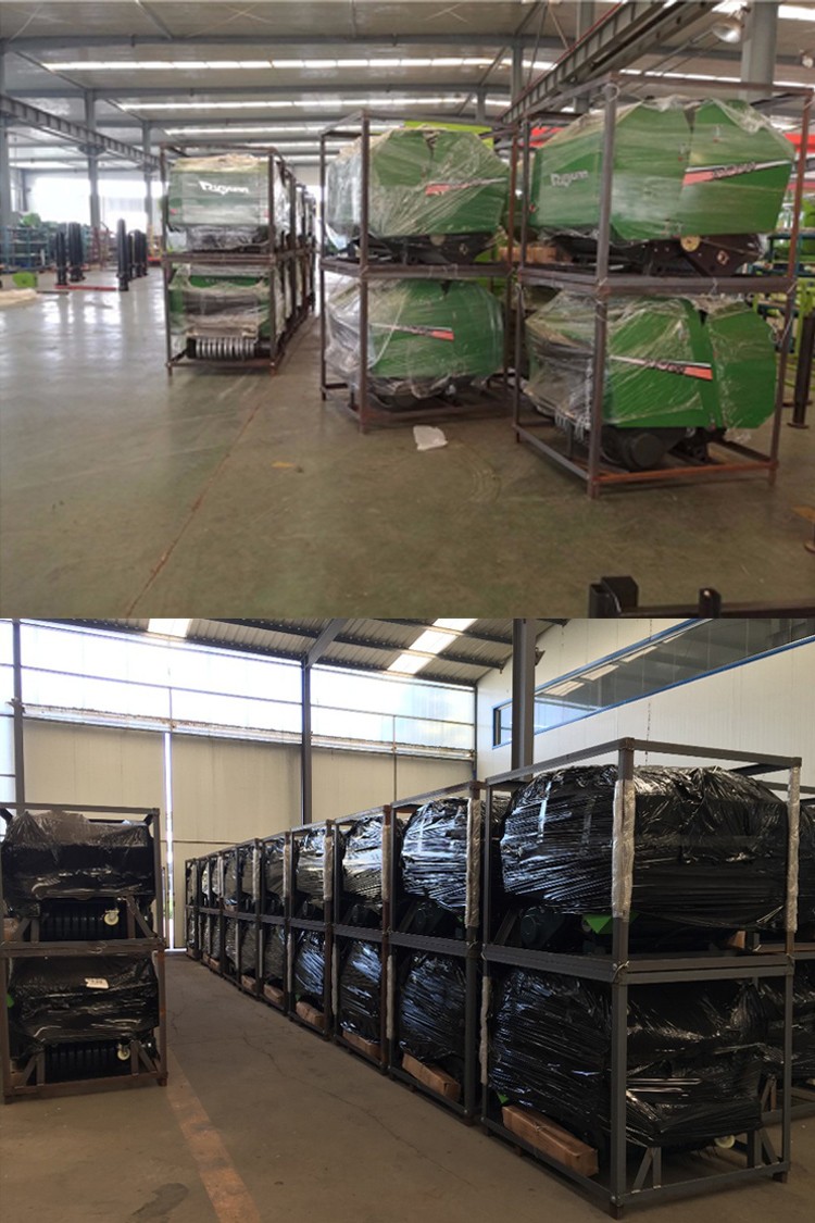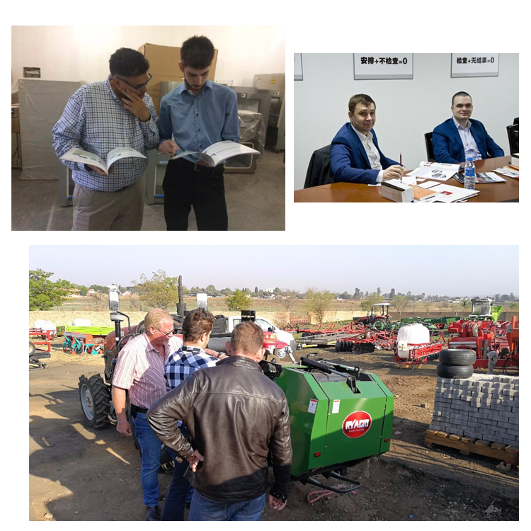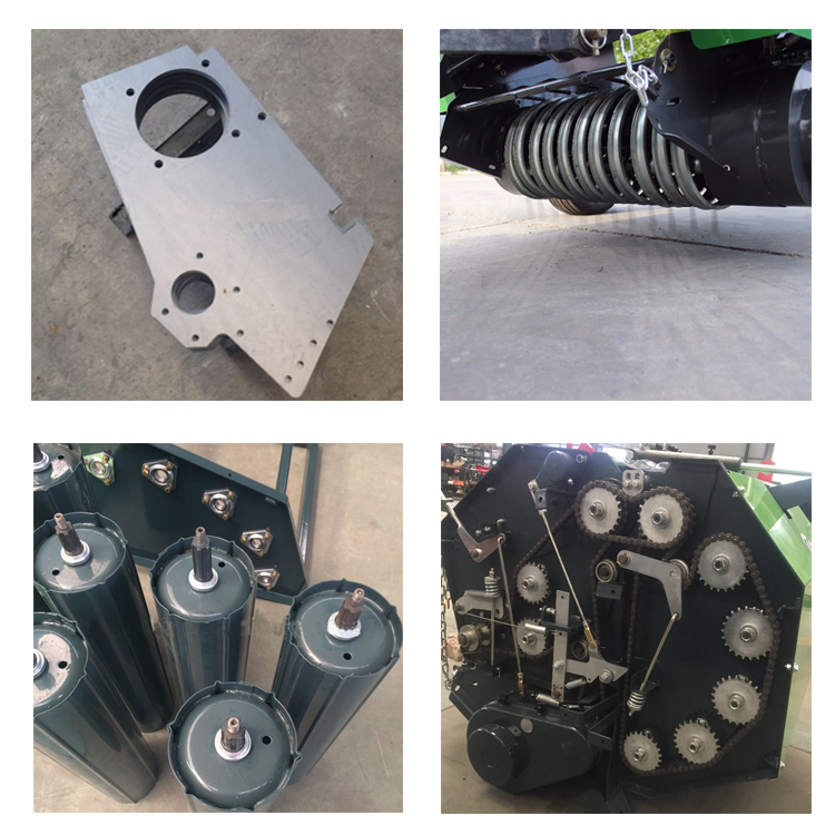 3). When the machine is going along with the tractor, the hay is picked into rotary platening chamber and rotating bigger and bigger, then get into very tight round bale.When the density of the bale is Ok , the alarming system will start to sound, driver should stop forwarding, push the threading clutch.